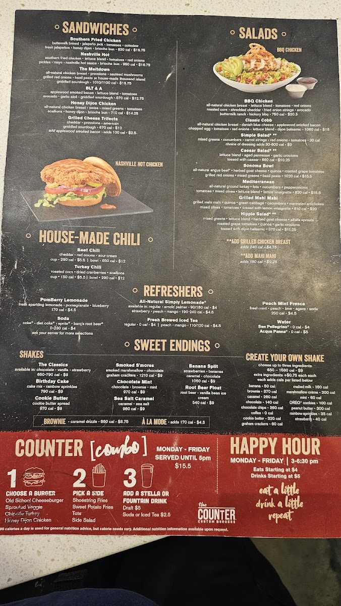 Customer reviews echo the sentiment of quality and flavor at The Counter. Patrons like Edward Mirzakhanian rave about the high-quality ingredients and friendly atmosphere, noting Sherry, the manager, who enhances the dining experience with her engaging Persian culture and warmth. Another guest, goldenlunafish, was particularly impressed with a fried chicken sandwich, calling it “delicious,” highlighting the restaurant's commitment to freshness and flavor.
